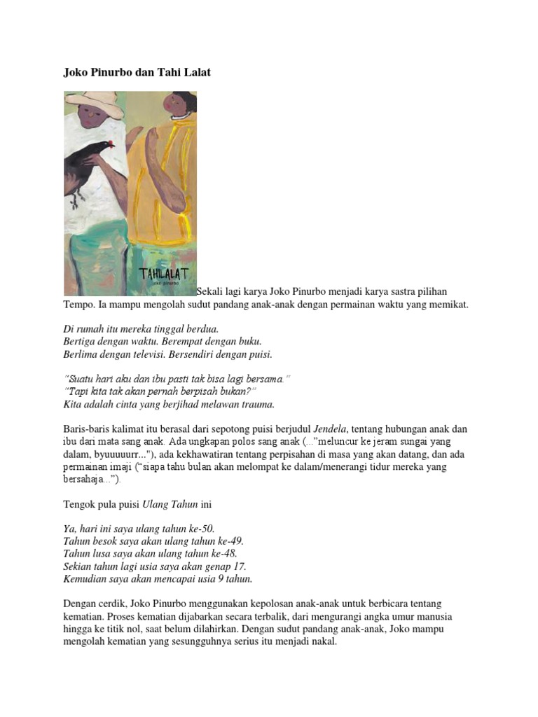 JOKO PINURBO DAN PECAHAN HIDUP SEHARI-HARI JIKA hidup sehari-hari ingin memecah diri menjadi puisi mereka akan memilih Joko Pinurbo sebagai penggubahnya. Ibu itu mengasuh anak-anaknya sendirian sejak suaminya dipinjam negara untuk dijadikan kelinci dalam percobaan sistem keamanan. Ibu yang Tabah - Puisi Joko Pinurbo.