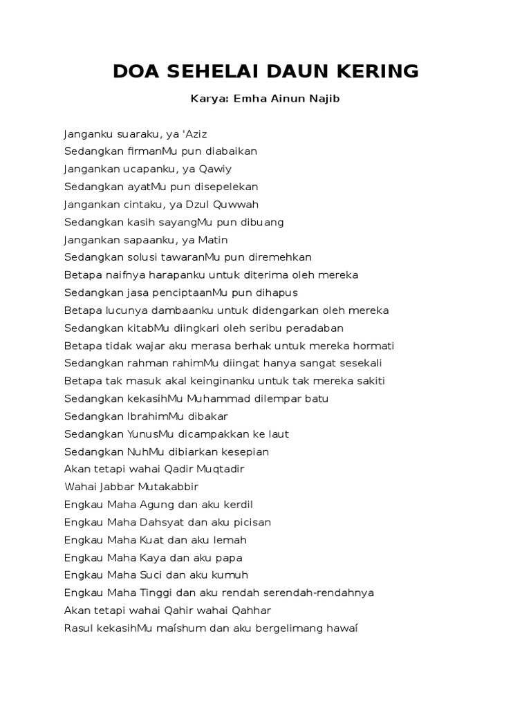 Read the rest of. DOA SEHELAI DAUN KERING Puisi Karya Emha Ainun Nadjib Jakarta 11 Pebruari 1999 Janganku suaraku ya Aziz Sedangkan firmanMupun diabaikan Jangankan ucapanku ya Qawiy Sedangkan ayatMupun disepelekan Jangankan cintaku ya Dzul Quwwah Sedangkan kasih sayangMupun dibuang Jangankan sapaanku ya Matin Sedangkan solusi tawaranMupun diremehkan. Safety How YouTube works Test new features Press Copyright Contact us Creators.
