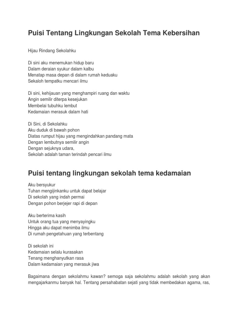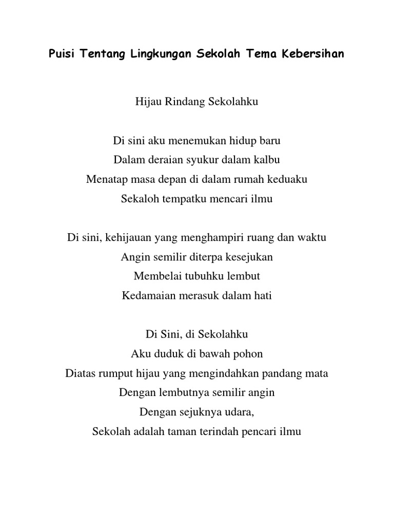 Jan 29 2019 Sekolah merupakan lingkungan tempat kita semua menimba ilmu dan menambah pergaulan. Jaga Kesehatan dan Lingkungan. Oct 06 2018 Kumpulan puisi tentang lingkungan hidup kali ini banyak terinspirasi dari banyak hal seperti pergantian musim keadaan alam serta bencana ataupun tentang lingkungan hutan di Indonesia.