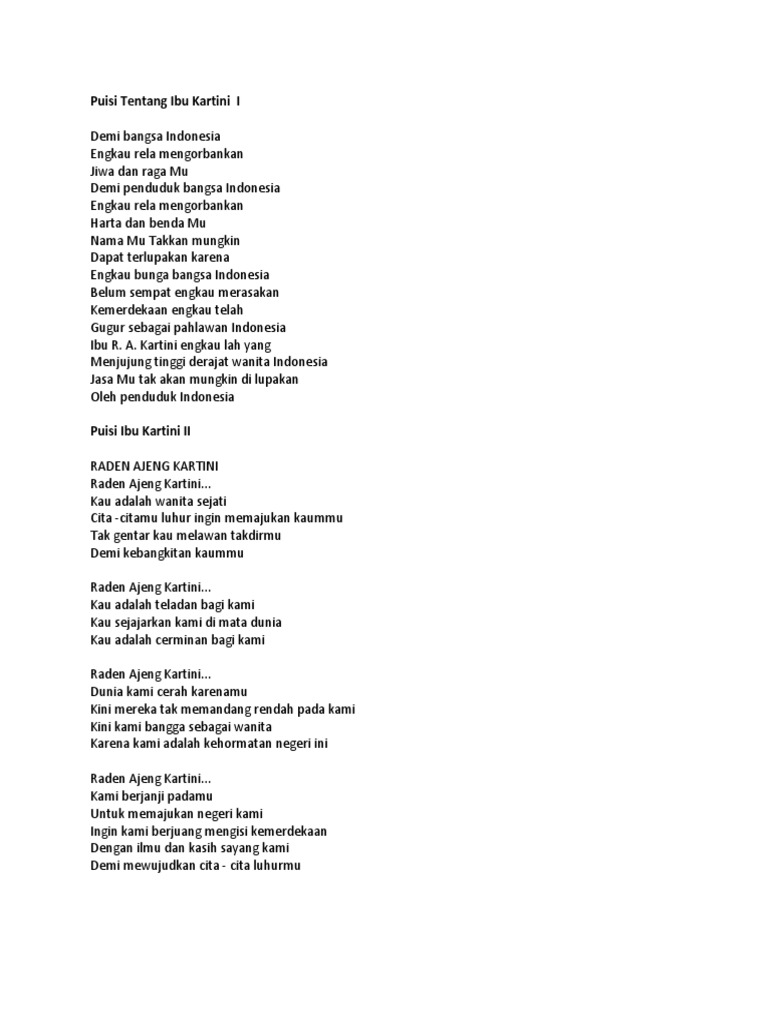 Kumpulan 30 puisi tentang wanitademi memenuhi tugas mku bahasa indonesiadosen pengampu. Sehingga tidak heran bila dalam memperingati hari kartini begitu banyak pertunjukan pertunjukan dan lomba lomba diadakan disetiap sekolah sekolah di indonesi. Tidak hanya itu beberapa puisi itu juga bisa.