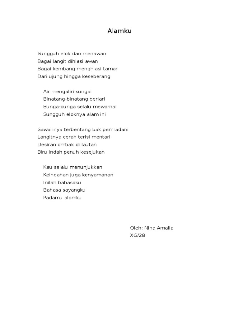 Alam ini harus terus dijaga agar keindahannya masih tetap terjaga. Contoh puisi lama beserta pengarangnya. Puisi bisa menjadi ungkapan kita akan sesuatu yang kita lihat dan kita rasakan dengan kata kata yang imajinatif.