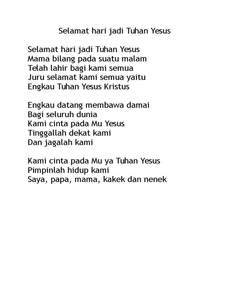 KAU kan datang lagi tuk menjemputku. Tuhan Yesus aku menikmati jalan-Mu yang begitu panjang ini karena dengan ini aku mengasah iman percayaku agar selalu bergantung penuh kepada-Mu Tuhan Yesus aku meresapi waktu-Mu yang begitu lama ini karena dengan ini aku belajar untuk menyerah di kaki-Mu dan tidak menjadi sombong jika aku sukses Tuhan Yesus. Puisi lama adalah pantun dan syair.