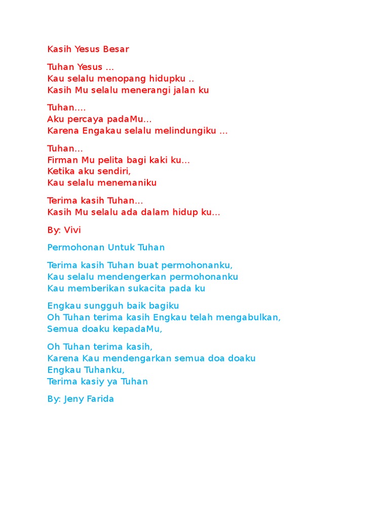 Tuhan terimakasihengkau telah hadir di antara kitasungguh besar karuniamu tuhan sehingga dapat membantu kami dalam hal apapun itu. Puisi tentang kebaikan tuhan yesus. Aku bisa nulis puisi ulasan buku dan bersaksi tu semuanya krn kasih karunia Tuhan Yesus Kristussesuai 1 korintus 1510 a Kalo gakaku cuma debu dan sampah yg ga berguna I hope we can be light and salt in the darkness of the world through our faith in Jesus Christ With Him we can do everything.