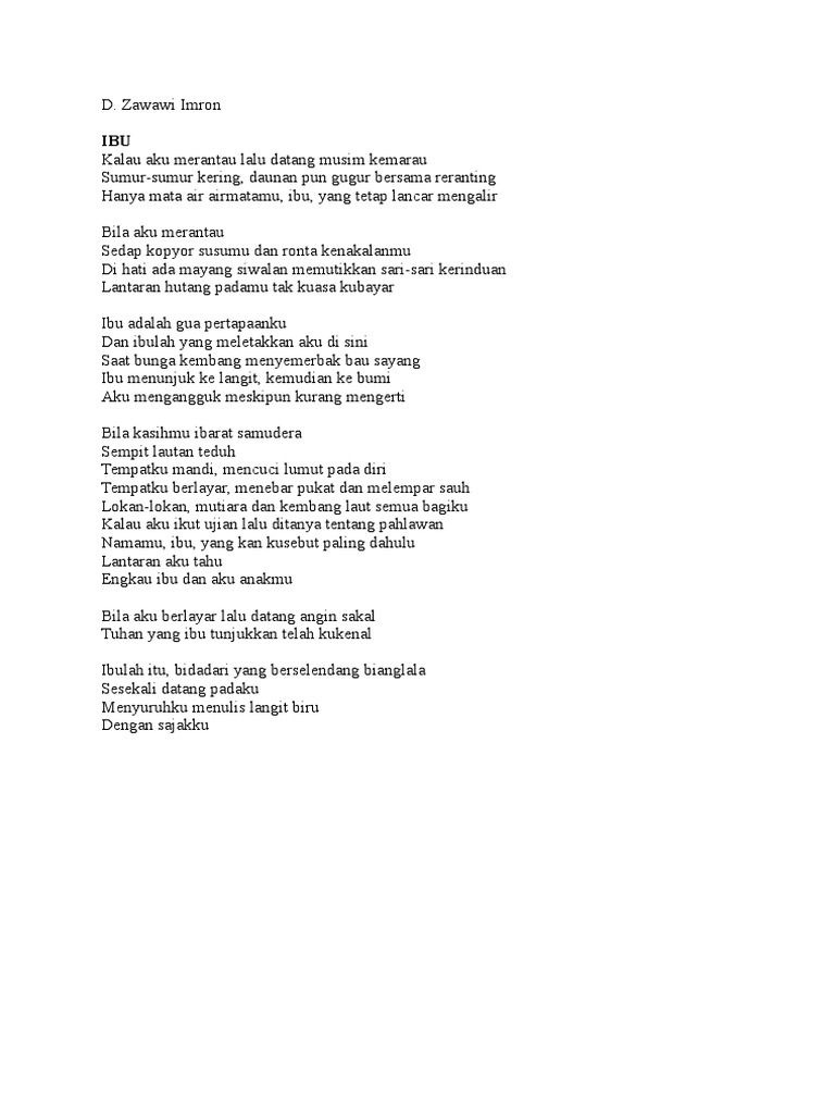 Pernah aku ditegur Katanya untuk kebaikan Pernah aku dimarah Katanya membaiki kelemahan. Nov 15 2017 Pengertian Bait dan Rima Puisi Lengkap - Dalam membuat sebuah puisi kumpulan baris yang tersusun dapat pula disebut bait. 3 Comments on Sajak Ibu di Atas Debu WS Rendra.